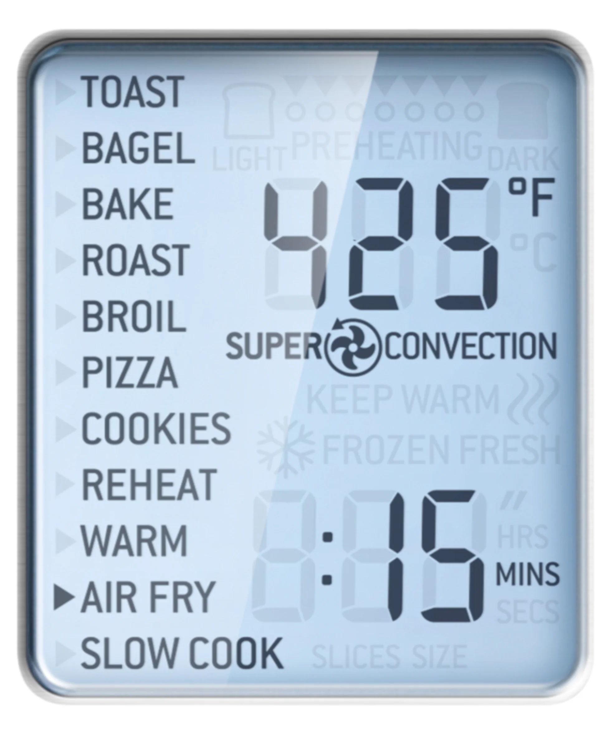11 cooking functions to guide you to perfection: Toast 6 slices, Bagel, Broil, Bake, Roast, Warm, Pizza, Air Fry, Reheat, Cookies and Slow Cook for long cook times, at low temperatures.
